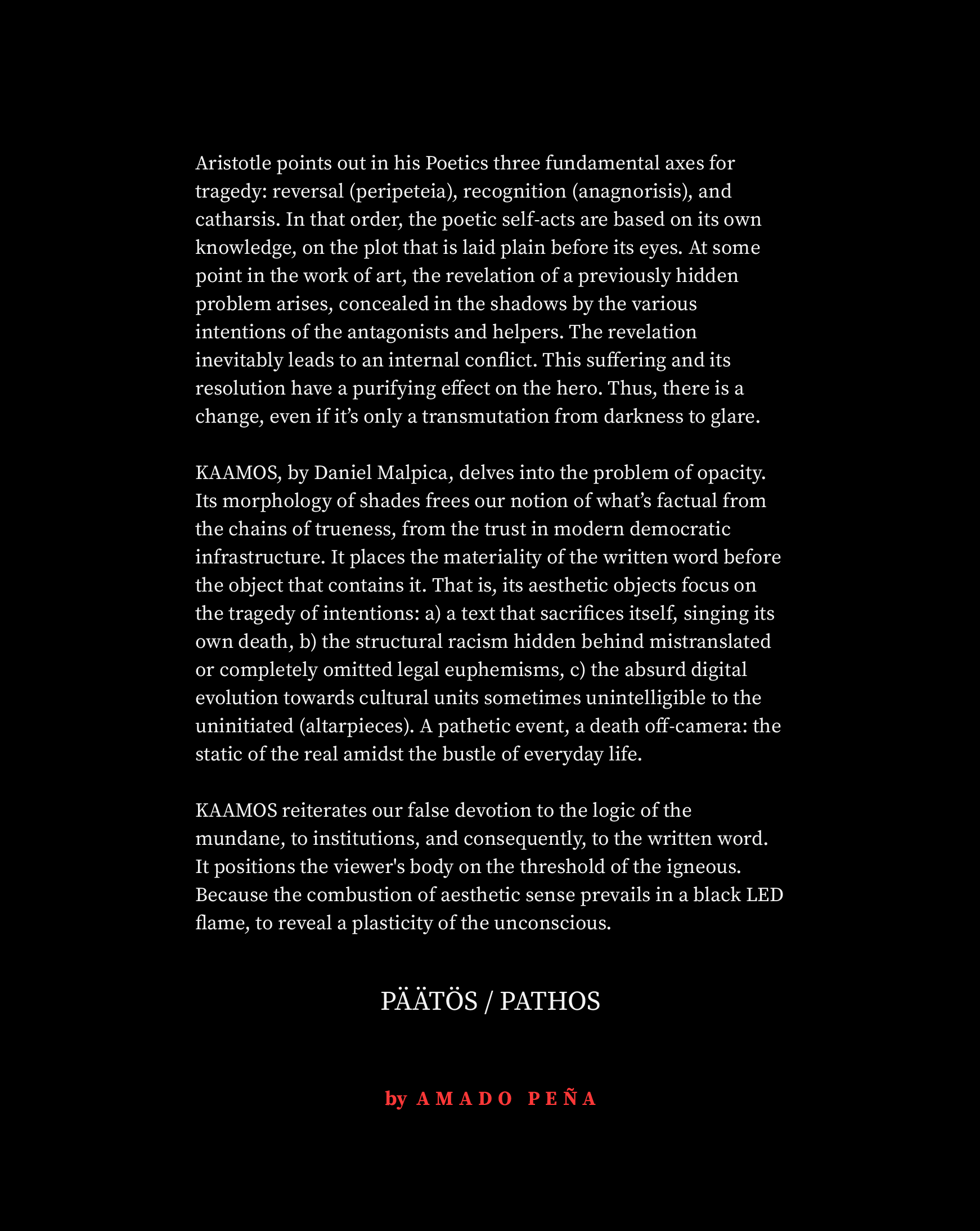 An exhibition that showcased a self-curated installation of Malpica’s works and his embracement of darkness, ranging from the realms of motion poetry to altered film. / Sound works by Pedro MacLoughlin