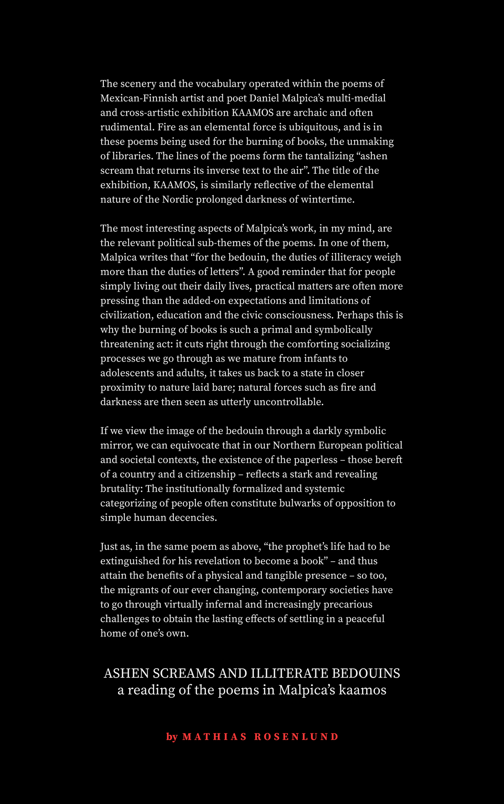 “In my own work, whether it’s a text, a digital installation, or a performance, the distance between literature, design, and other media has never had very distinctive borders. Everything seems to me as a unified part of an expanded poem” Malpikka reflects. This holistic approach has characterized his career, which weaves diverse strands across Europe, Mexico, and beyond.